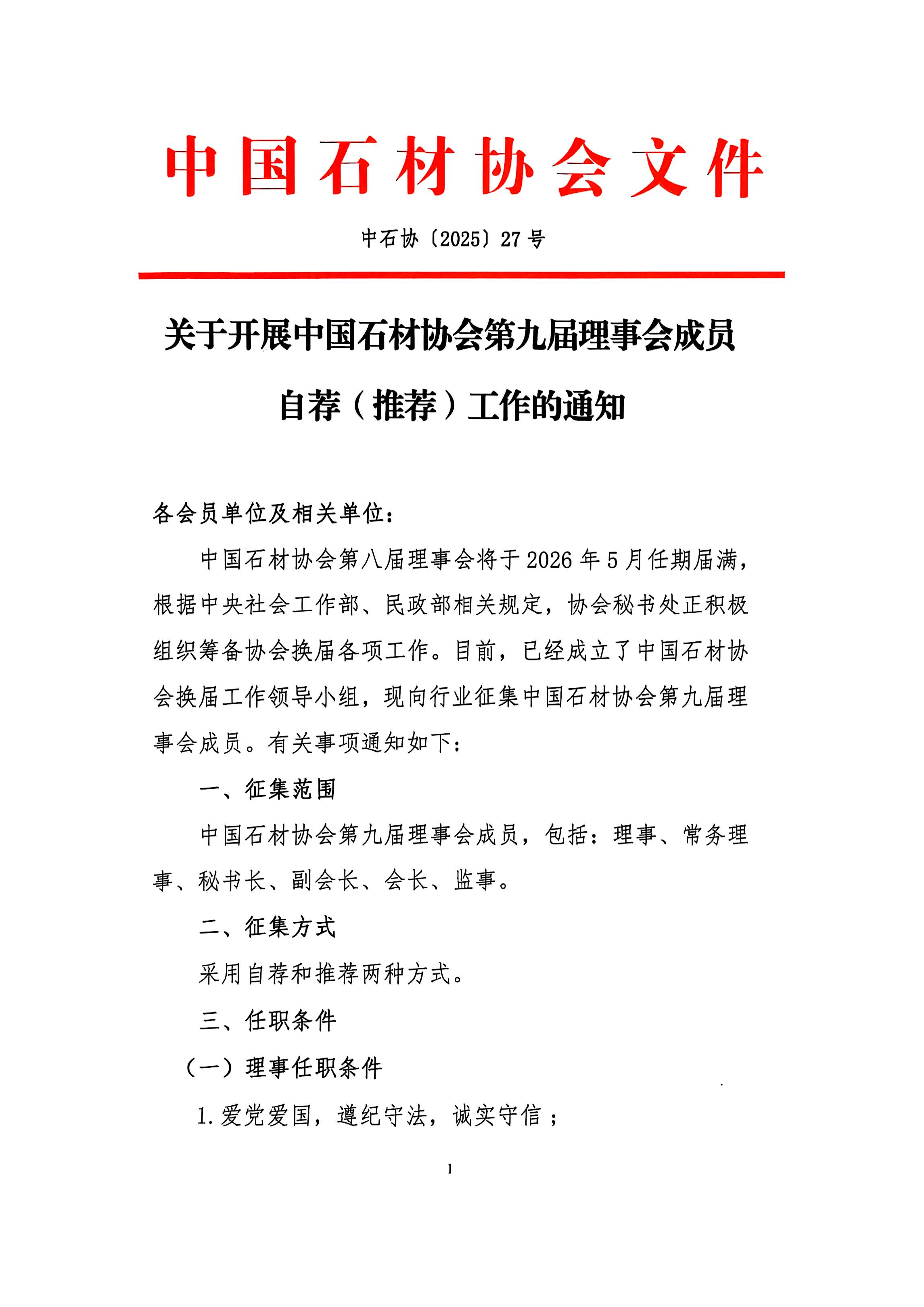 關(guān)于開(kāi)展中國(guó)石材協(xié)會(huì)第九屆理事會(huì)成員自薦(推薦)工作的通知